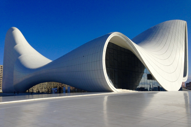 アゼルバイジャンの首都バクーに建てられた複合施設である『ヘイダル・アリエフ・センター』は、曲線の女王といわれたザハ・ハディドの設計です。