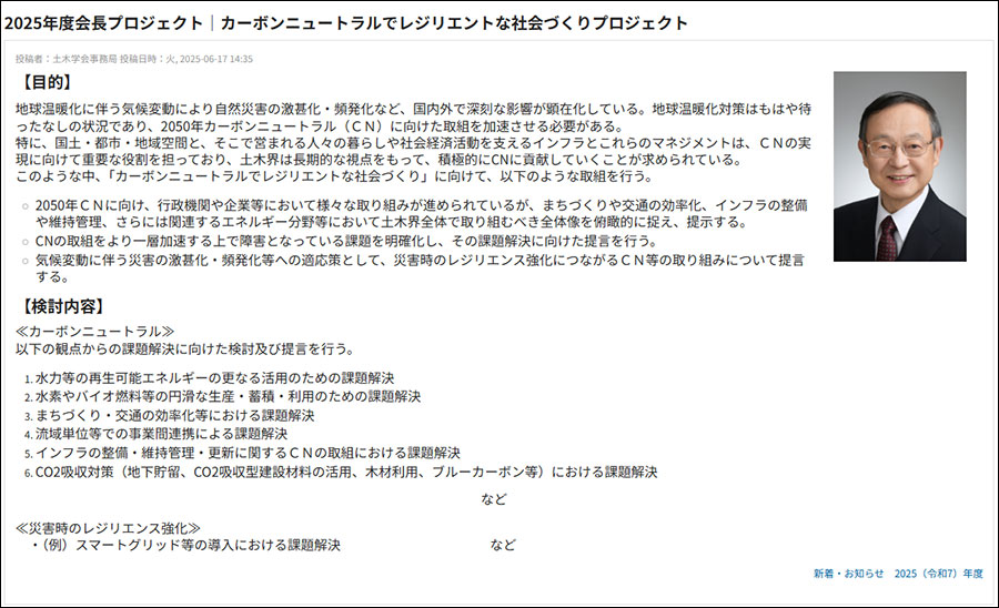 土木学会からは池内幸司会長が登壇し、2025年度の会長特別プロジェクトとして取り組む『カーボンニュートラルでレジリエントな社会づくりプロジェクト』の概要について講演しました。