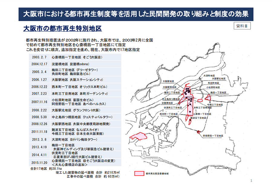 こちらは都市再生特別措置法を活用し、大阪駅から南北に広がる区域で計17地区が「都市再生特別地区」の指定を受け、それぞれ再開発を行いました。面積は合計38.1haにも渡り、先ほどの六本木ヒルズよりもかなり広範囲に及びます。