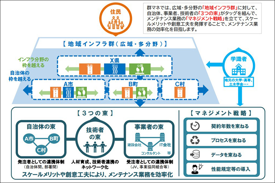 群マネはバラバラに管理していたインフラをグループとしてまとめて捉えることで、効率的・効果的に維持管理していく手法です。まとめ方は自治体の束や事業者の束があり、複数の関係者が協力し合い、スケールメリットを生かすことで、高い効果を発揮します。