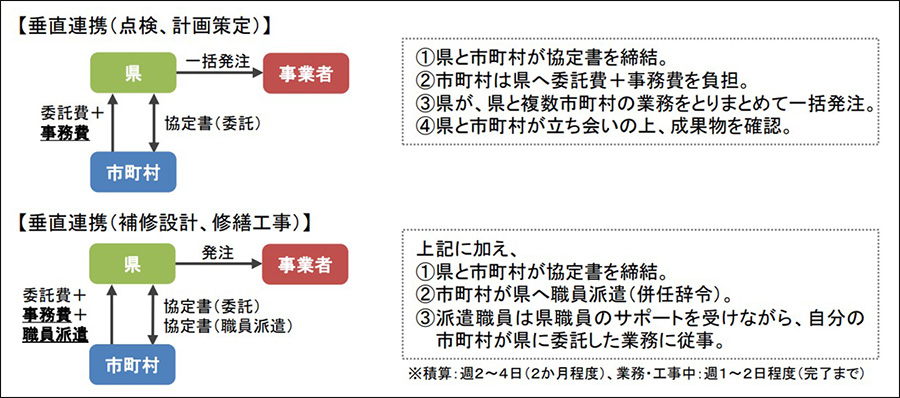 たとえば橋梁やトンネルの点検業務については、県と市町村の間で協定書を交わし、市町村は県に対して委託費と事務費を支払います。そして、県および市町村が所管する施設の点検業務を県が事業者に一括発注することで、効率的に点検を進められる仕組みです。