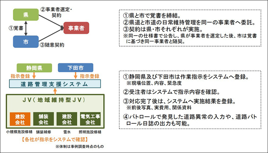 静岡県と下田市では、道路の維持管理業務を共同発注しています。両者は覚書を結んだ上で、県が事業者を選定・契約し、市は県と同一の事業者と随意契約を結ぶスキームです。