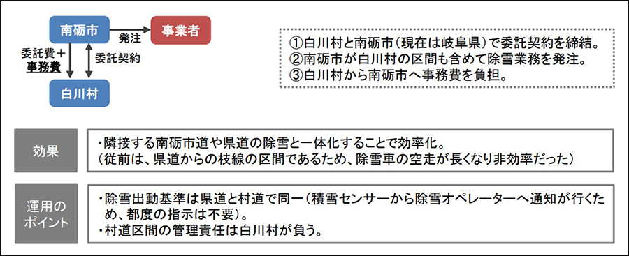 両者で委託契約を交わし、南砺市が事業者に除雪業務を発注しています。以前は、除雪車の空走距離が長く、非効率な運用が課題となっていましたが、両自治体で一体的に除雪することにより、作業が効率化されました。なお、現在は岐阜県がこの一体的な除雪業務を代行しています。