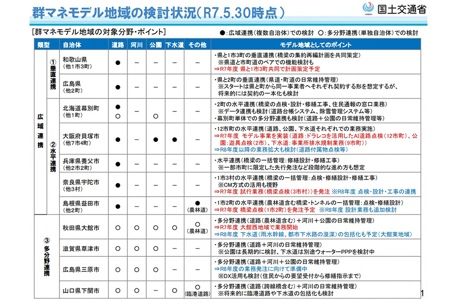 2023年12月、国土交通省は群マネの全国展開を視野に、具体的な検討を進めるための11のモデル地域を選定しています。