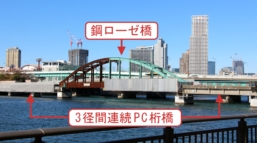構造:鋼ローゼ橋および3径間連続PC桁橋