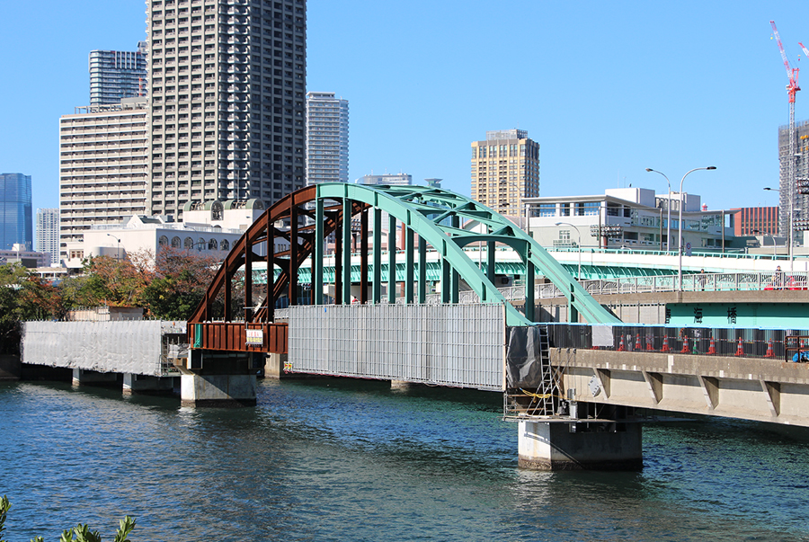 貨物輸送専用の鉄道・晴海線の一部として架設された「旧晴海鉄道橋」です。