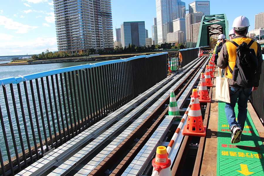 レールは旧晴海鉄道橋の架設当時のもの、つまり製造から70年以上が経過したものをそのまま使用しているため、高さにばらつきが見られるのだそう。そんなレールと高さをそろえ、段差が生じないように木材を並べる作業は緻密な調節が必要で苦労しているといいますが、「供用後、皆さんに安心して歩いてもらえるようがんばって取り組んでいます」と力強く語っていました。