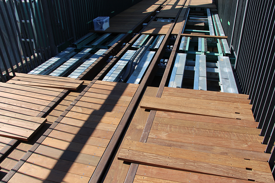 現在はウッドデッキの設置作業中です。上部工の補修などのために外していた鉄道のレールを戻し、間に木材を敷き詰めてフラットにしていきます。使用している木材は南米産で、木の密度や重さ、耐久性などを考慮して選定したものだそうです。