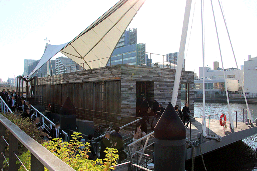 近くには船上イベントスペース(左)や宿泊もできる多目的船(右)もあり、いずれも同じく水域占用許可を得て運河に浮かべています。ちなみに、船上イベントスペース「T-LOTUS M」は建築家の隈研吾氏によるデザイン監修とのこと。