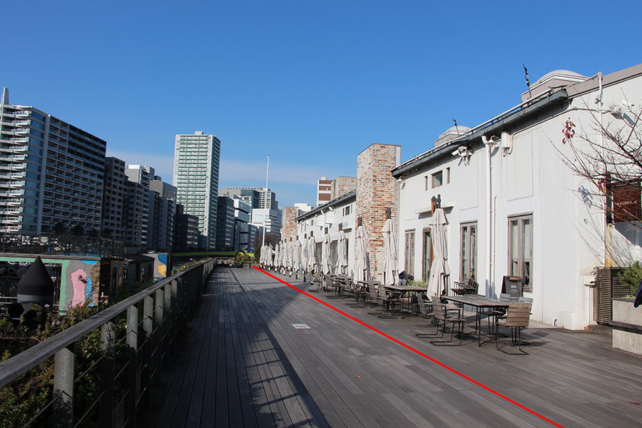 写真の赤線のあたりを境界に、右側が寺田倉庫の敷地(民有地)、左側が公有地となっており、公有地部分も含め、地区計画に基づいて寺田倉庫が自費で一帯を整備し、行政に寄付したものだそうです。維持管理は同社が行っているといいます。