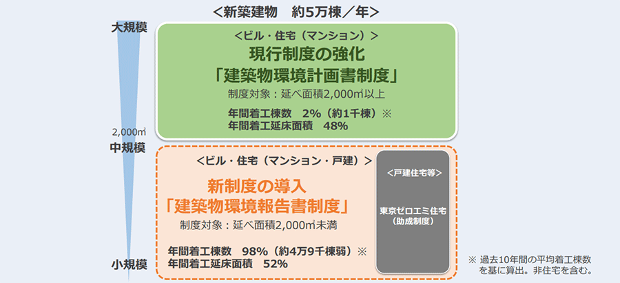 2022年12月、東京都の環境確保条例が改正されました。これにより、大規模建築物を対象とした既存制度「建築物環境計画書制度」の内容を強化・拡充し、さらに戸建て住宅など中小規模建築物が対象となる「建築物環境報告書制度」を新設、それぞれ2025年4月から施行することとなりました。