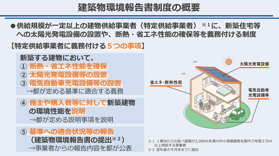 建築物環境報告書制度とは、今回の環境確保条例改正に伴って創設され、2025年4月に施行となる新制度。戸建て住宅など延べ床面積2000㎡未満の中小規模建築物を新たに建設または新築する“特定供給事業者”に対して、建築物における環境配慮の取り組みなどを義務化し、基準への適合状況等の報告を求める制度です。