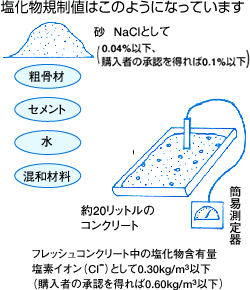 塩化物含有量が多いとコンクリート中の鉄筋の腐食につながるため、正しく管理しなければなりません。「JIS A 5308(レディーミクストコンクリート)」では、荷卸し地点での塩化物イオン量を0.30kg/m3以下としなければならないと定められています。