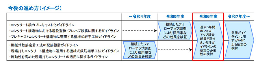 現場打ちコンクリートとプレキャストコンクリート(詳しくは「プレキャストの活用」にて解説)において、各種ガイドラインのフォローアップ・改定検討を進めています。
