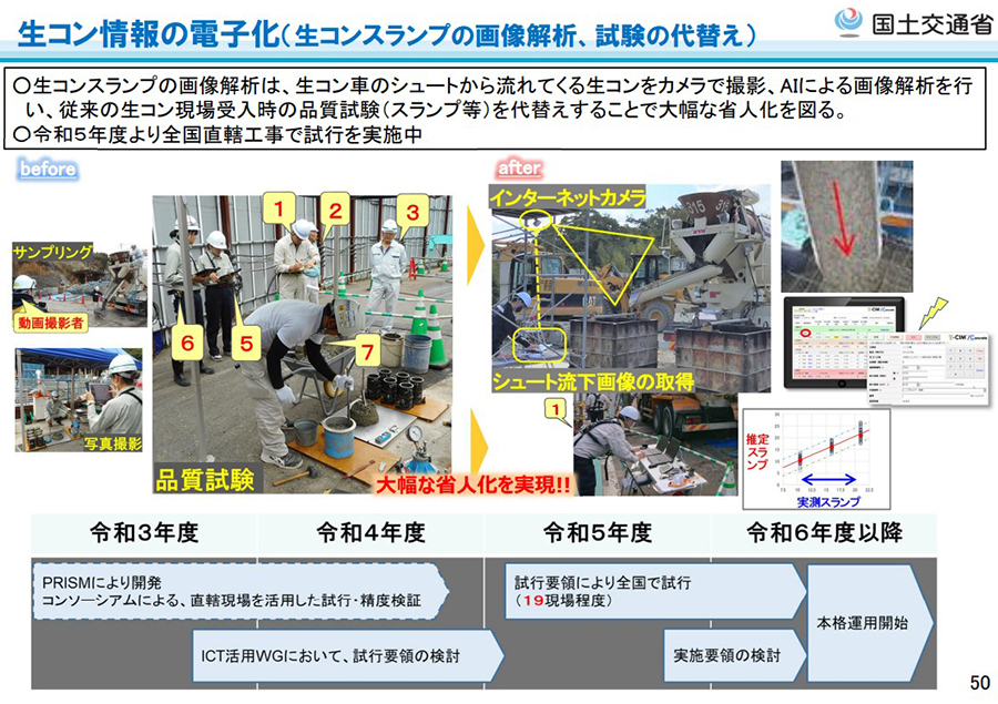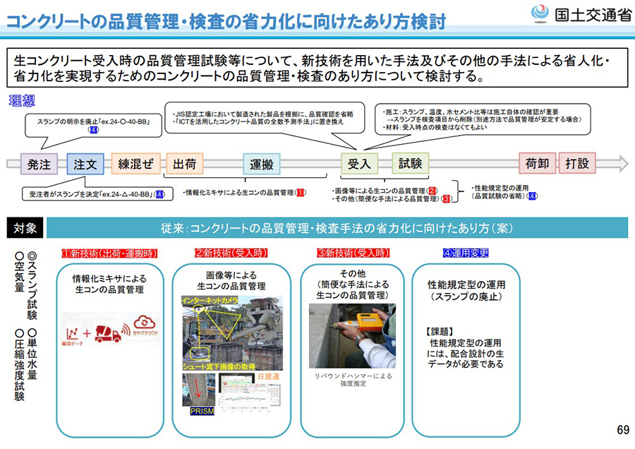 従来は発注者が行っているスランプの明示を将来的には廃止して、受注者がスランプを決定。出荷・運搬時は情報化ミキサによって生コンクリートの品質を管理し、建設現場での受け入れ時には画像解析などで品質管理することにより、検査項目からスランプを削除する(スランプ試験の廃止)、という流れを想定し検討しているとのことです。