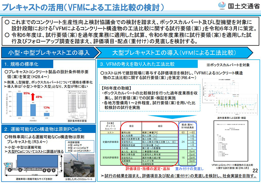 これまでに、ボックスカルバートやL型擁壁を対象として、設計段階からVFMの考え方を取り入れた評価を行うための「VFMによるコンクリート構造物の工法比較に関する試行要領(案)」を策定。この試行要領(案)を用いてプレキャスト工の試算・検証や試行を進め、評価項目や配点の見直しを行っています。