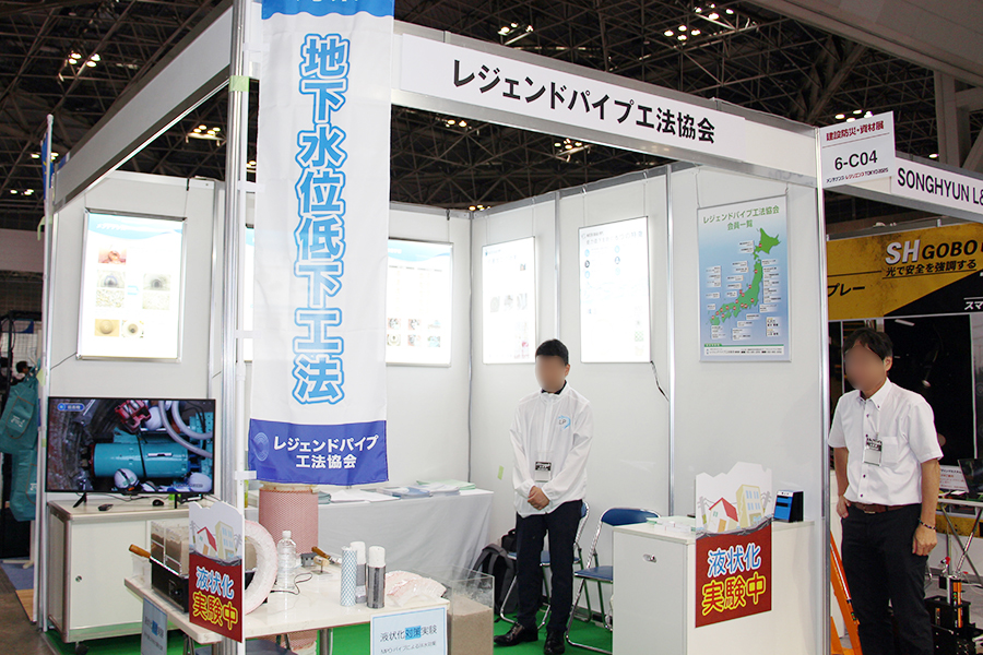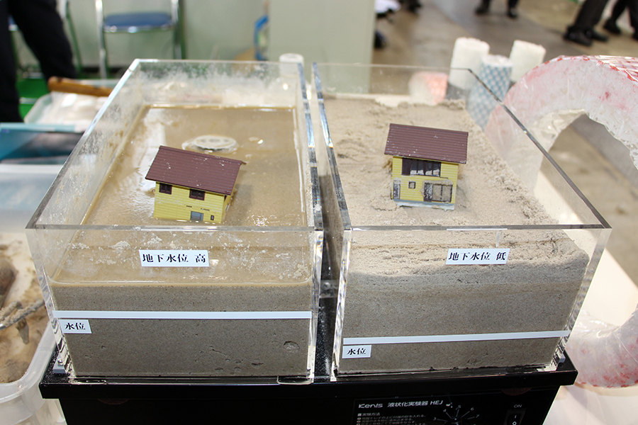 こちらはレジェンドパイプ工法協会のブースで行われていた、模型を使った液状化実験の様子。容器の中の砂を地盤に見立て、左右で水の量(地下水位)を変えています。ここに振動を与えると、地下水位が高い左の模型は表面に水が浮いてきている(液状化)のに対し、水位が低い右側は液状化が起こっていません。