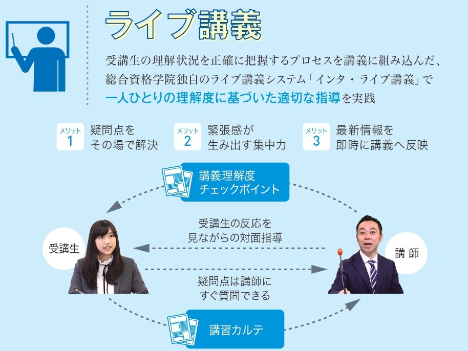 しかし、総合資格学院は、創立当初から講師が教壇に立ち直接指導を行う対面指導型の「ライブ講義」にこだわりつづけているそうです。