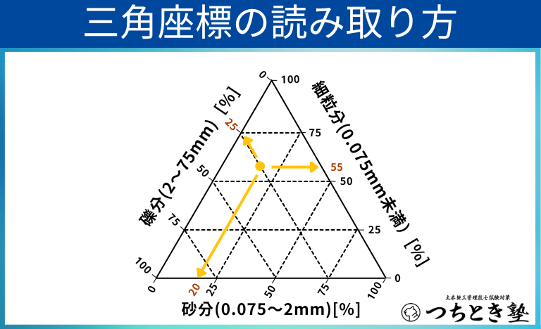 例えば、[粒度分布:細粒分 55%、砂分 20%、礫分 25%]