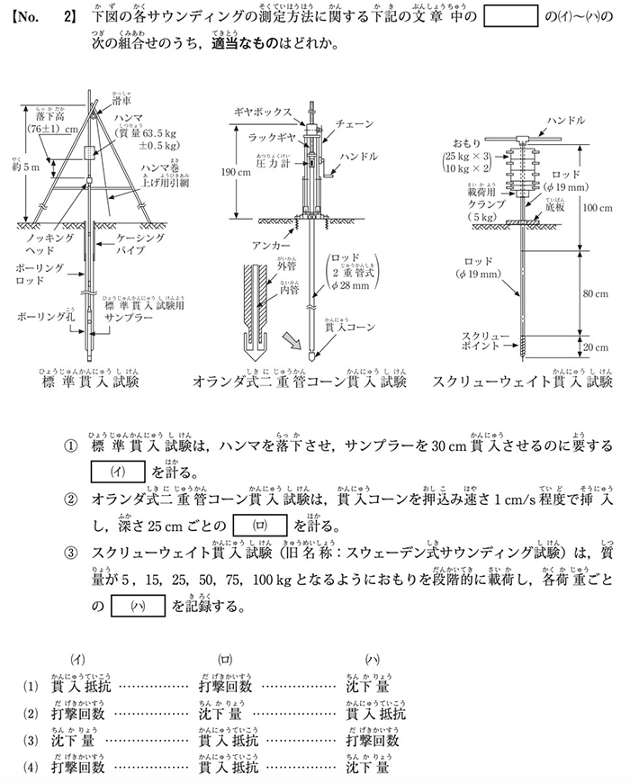 | スクリューウェイト貫入試験 | 直径19ミリの鋼棒の先端にスクリュー状の先端矢じりを装着し、地中に貫入させ、その貫入状況を確認する試験 | 貫入抵抗、コーン指数 |