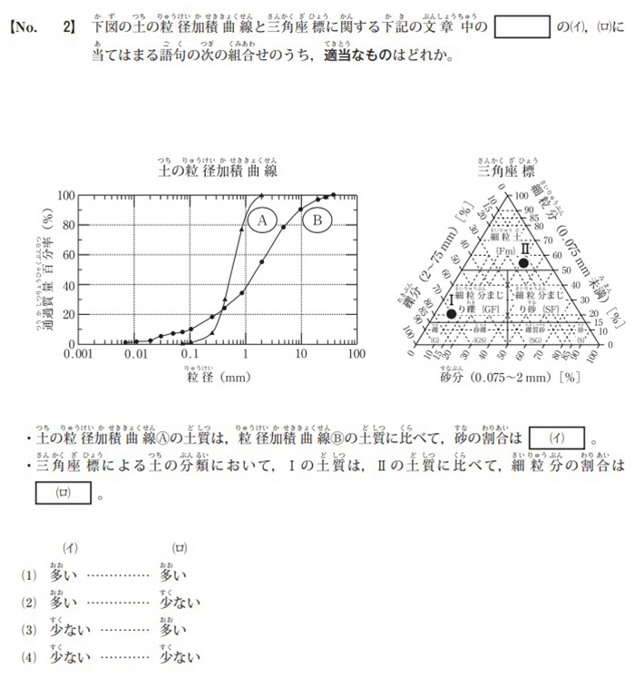 令和6年度1級の2問目は、土の粒度による分類に関する問題が出題されていましたが、令和7年度2級では問題が大きく変更されました。