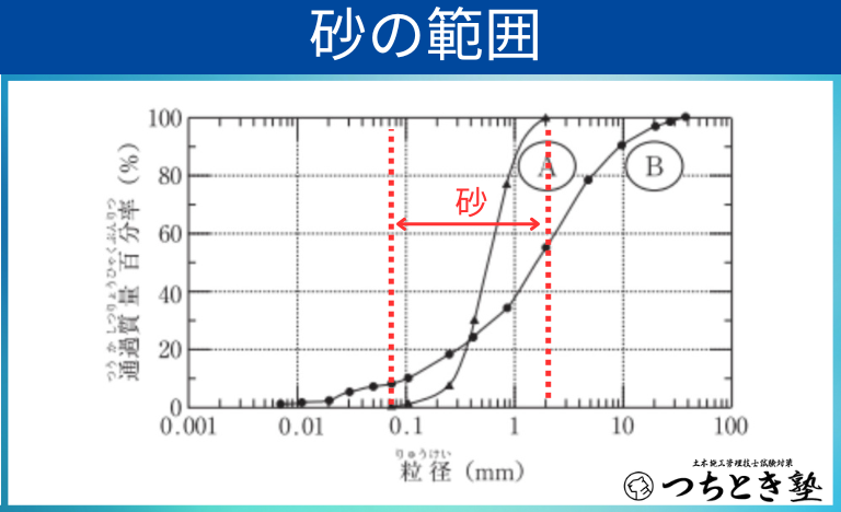 この分類を踏まえると、先ほどの粒径加積曲線における「砂」の割合というのは、以下の図の範囲となります。
