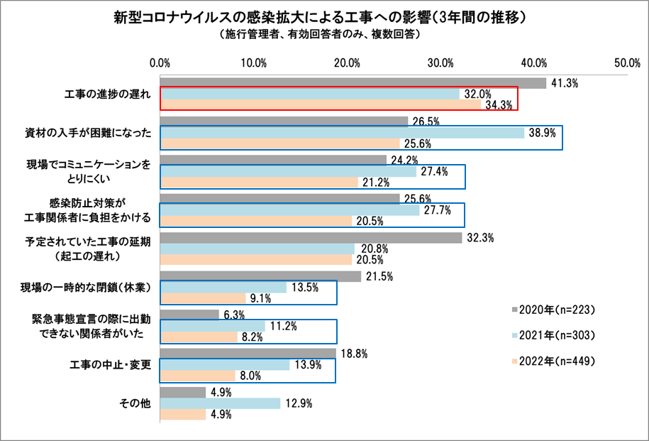 新型コロナウイルスの感染拡大による工事への影響は2022年は前年より減少