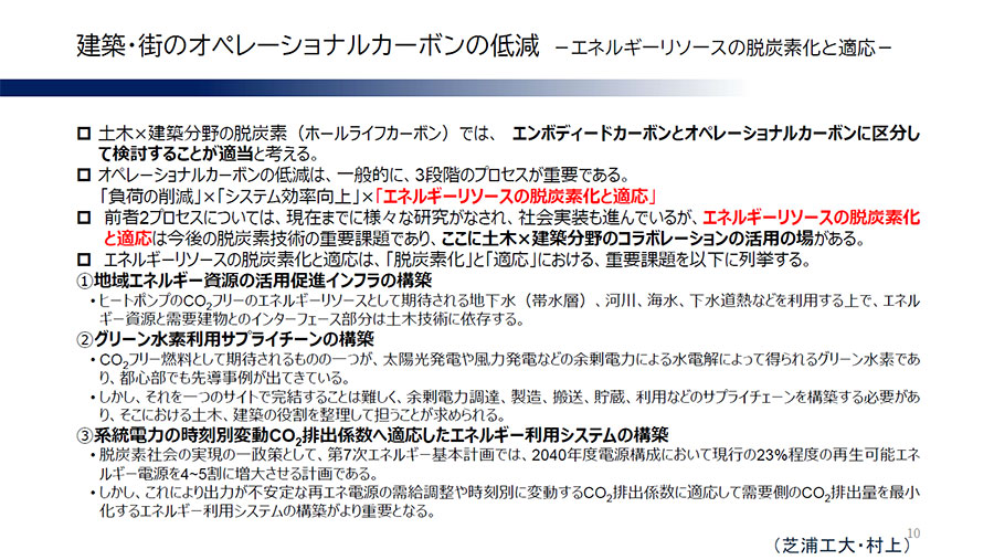 オペレーショナルカーボンの削減に向けては、建物や街で使用するエネルギー源の脱炭素化が重要な要素であるとし、GHGを排出しないエネルギー源として活用が期待される地下水、河川、下水、さらに洋上風力や揚水発電などは「土木技術に依存する分野。ここでの土木と建築の連携効果は非常に大きい」と説明しました。