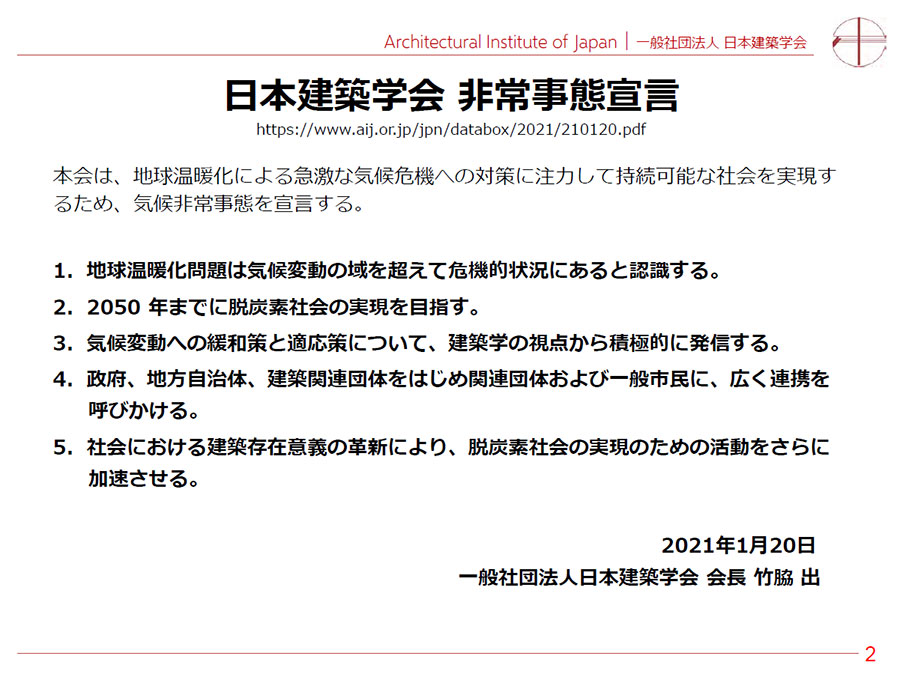 日本建築学会では2021年、地球温暖化の影響による急激な気候変動に対して『非常事態宣言』を発出しており、▽地球環境全体の問題▽脱炭素▽気候災害―の大きく3つについて取り組みを行っていることを小野田会長が説明しました。