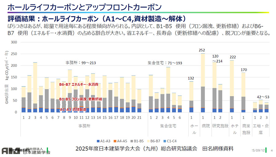 大岡委員長は、2025年9月の日本建築学会大会で同委員会の総合研究協議会を開催したことを報告し、その際の資料から、実際の建物でWLCを調査した結果を提示。