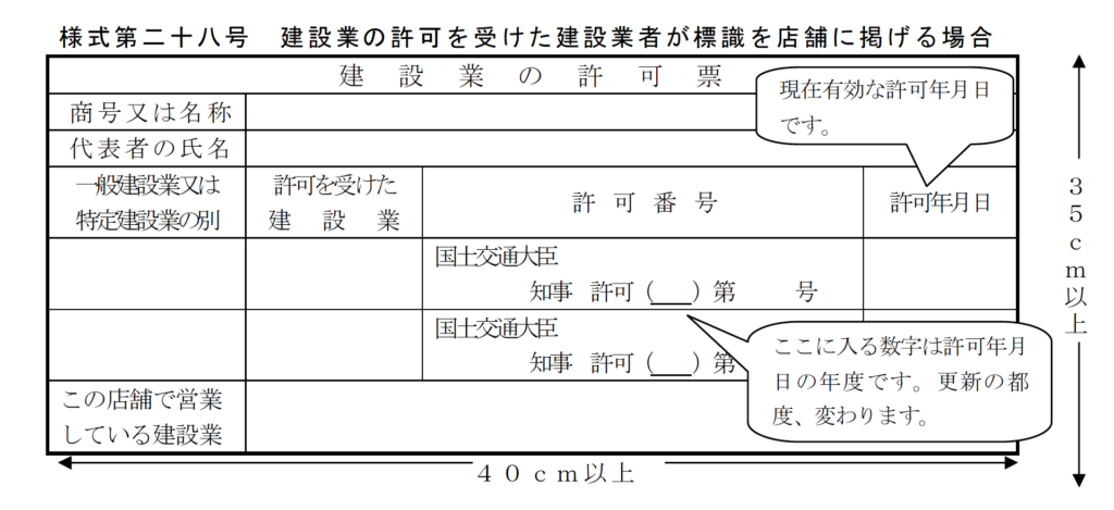 建設業許可が無事に取れたら、まずは許可を取った事業所に「建設業の許可票」を掲示しなければなりません。