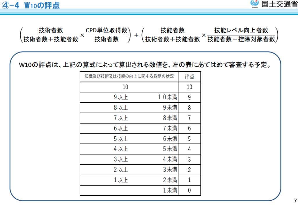 - 技術者:建設業者に所属する技術者が、審査基準日(決算日)以前1年間に取得したCPD単位の平均値で評価