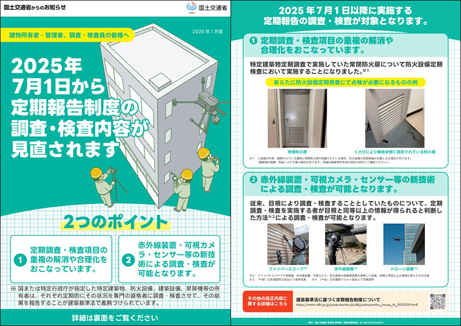 これらの調査・検査について、従来は目視により実施することとされていましたが、2025年7月施行の制度改正により赤外線装置やドローンなどの新技術を活用することも可能となりました。