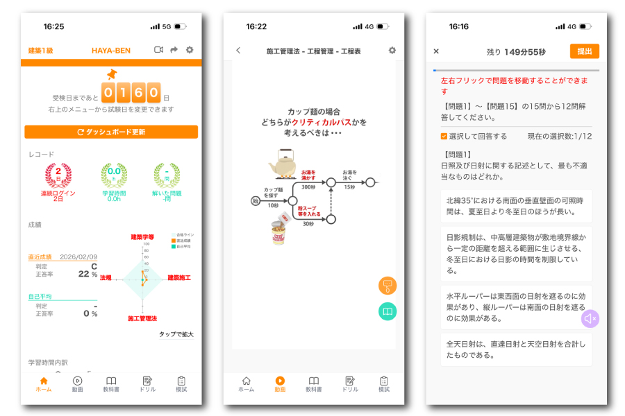 そうした思いで有賀さん・三輪さんを中心に、社内の有資格者にもレビューをもらいながら試行錯誤を重ね、ついに2024年7月、2級建築施工管理技士向け学習アプリ『HAYA-BEN』をリリース。2026年2月には1級向けの配信も始めました。