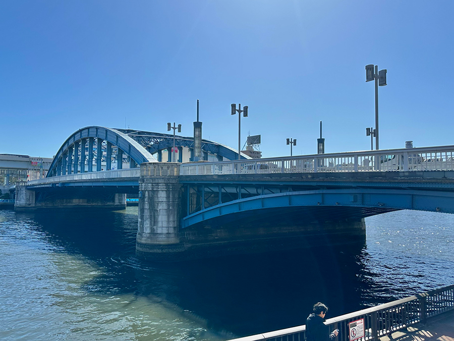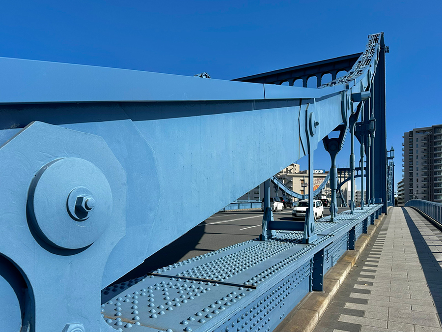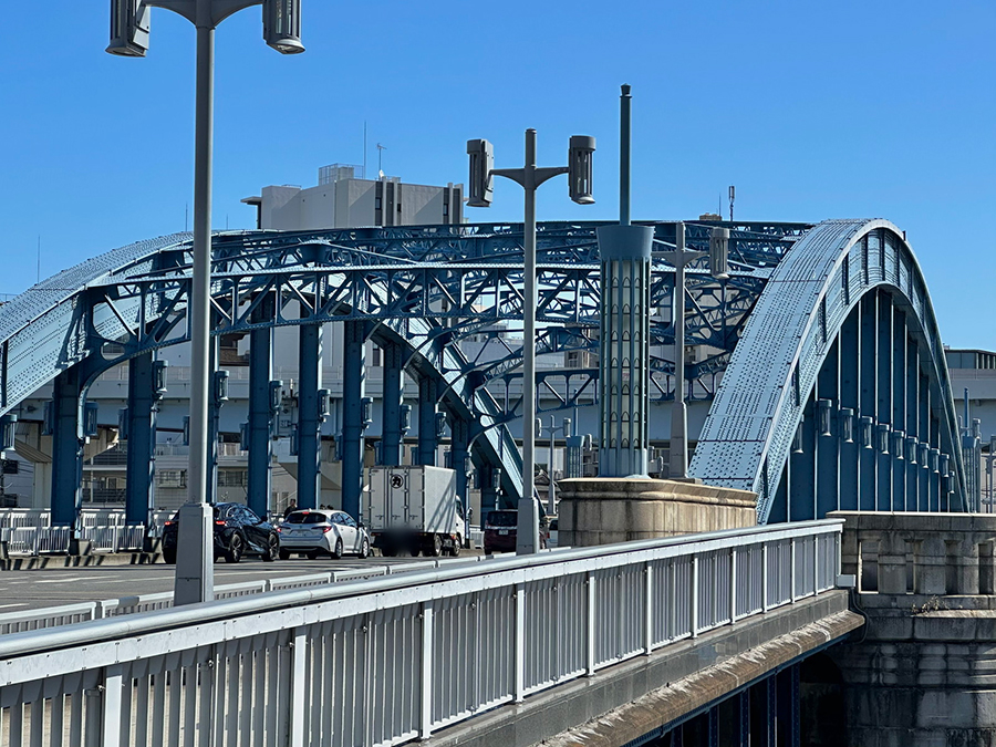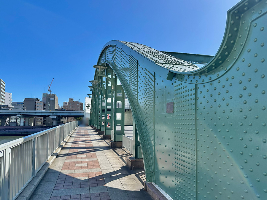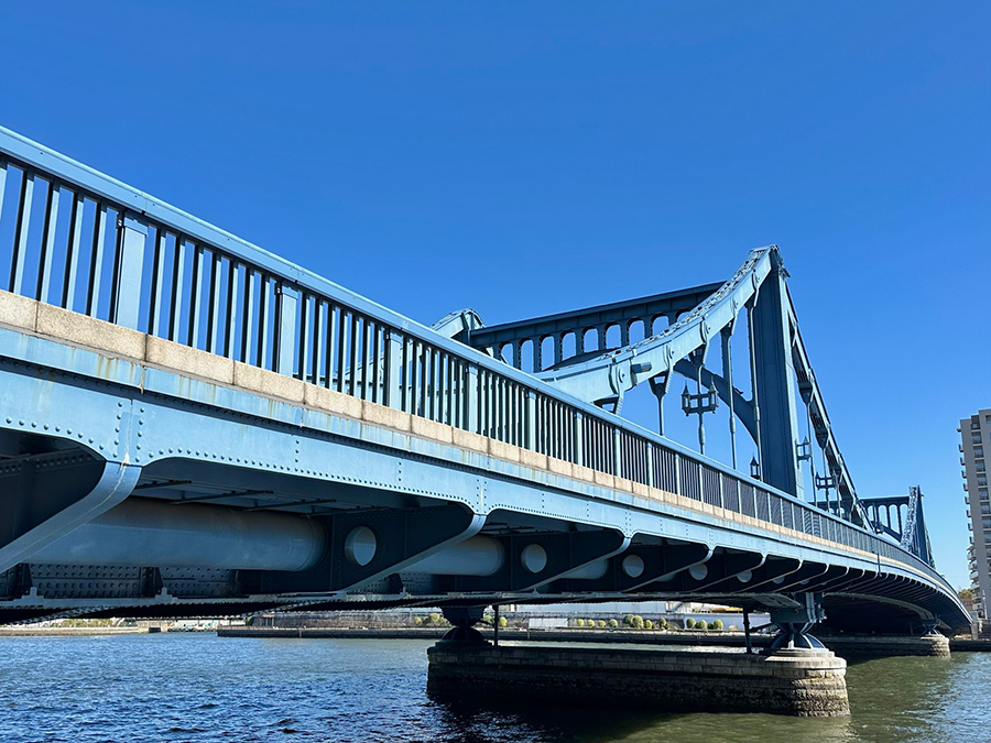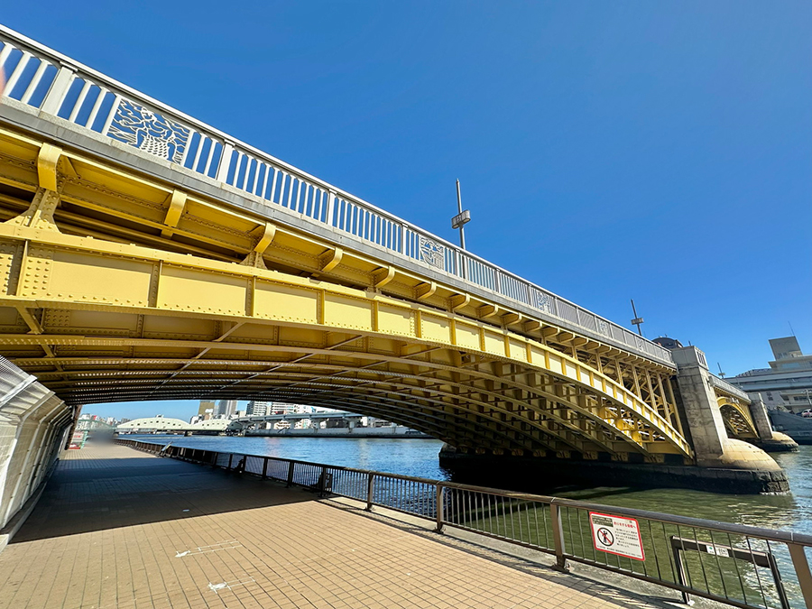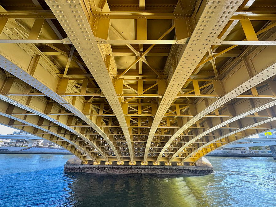 続く蔵前橋は3連アーチの上に橋桁が載っており、先ほど紹介した吾妻橋とカラーリング以外は酷似した形状です。一方で吾妻橋と明確に違うのは、橋の下。吾妻橋の橋下は墨田区側が通り抜け不可、台東区側が小さなトンネル通路になっているのに対し、蔵前橋は川沿いの遊歩道がそのまま橋下を通っているので、アーチ橋の鉄骨を橋の裏側からじっくり観察できます。