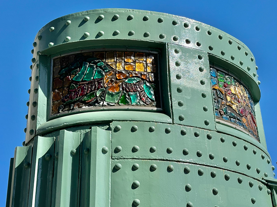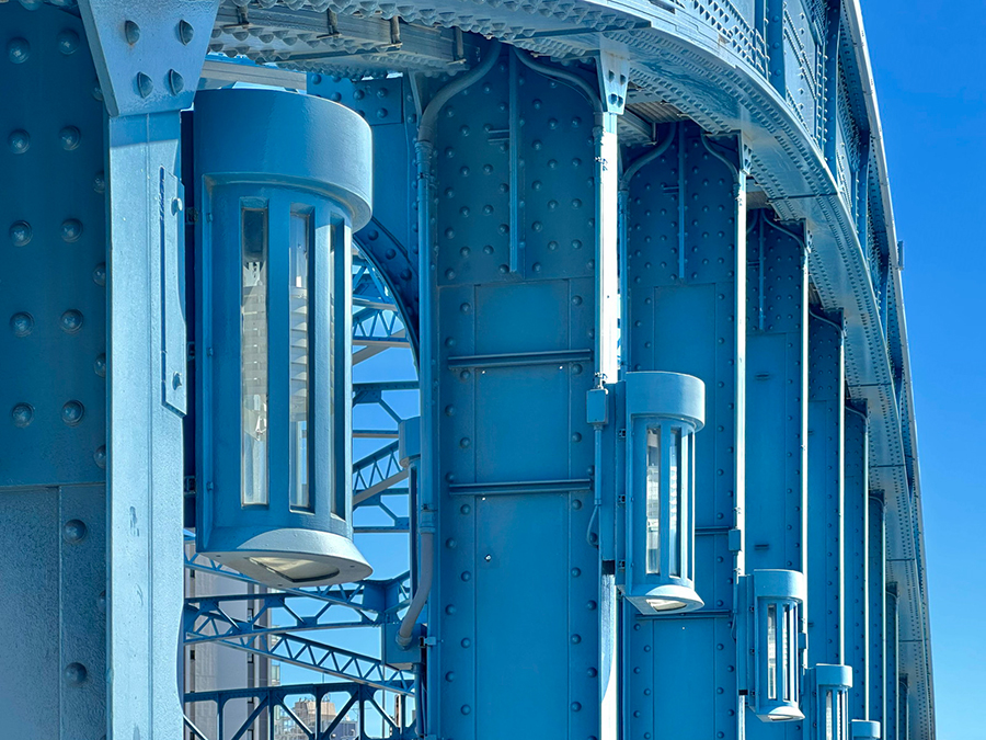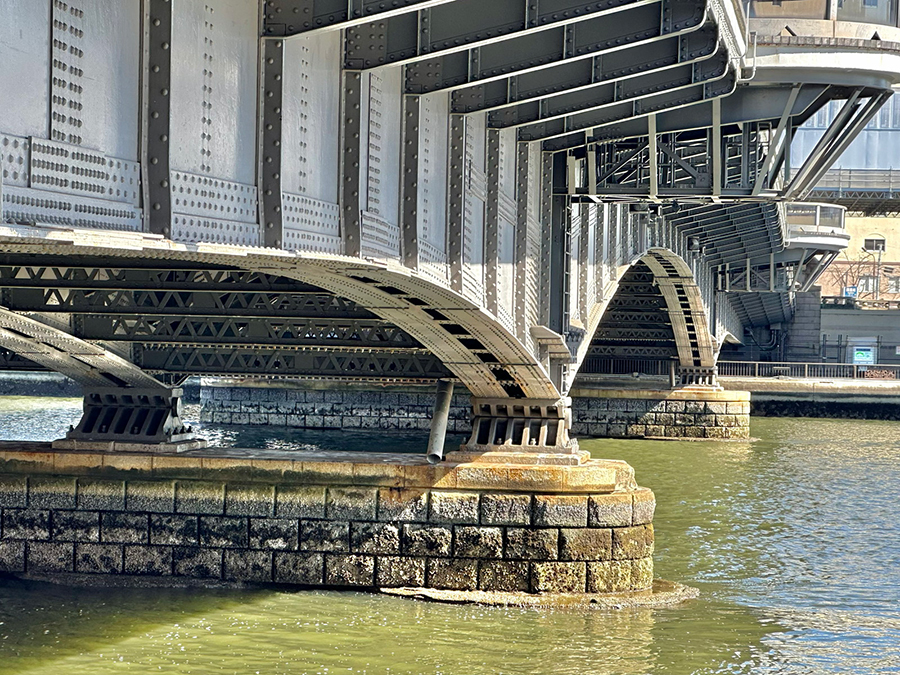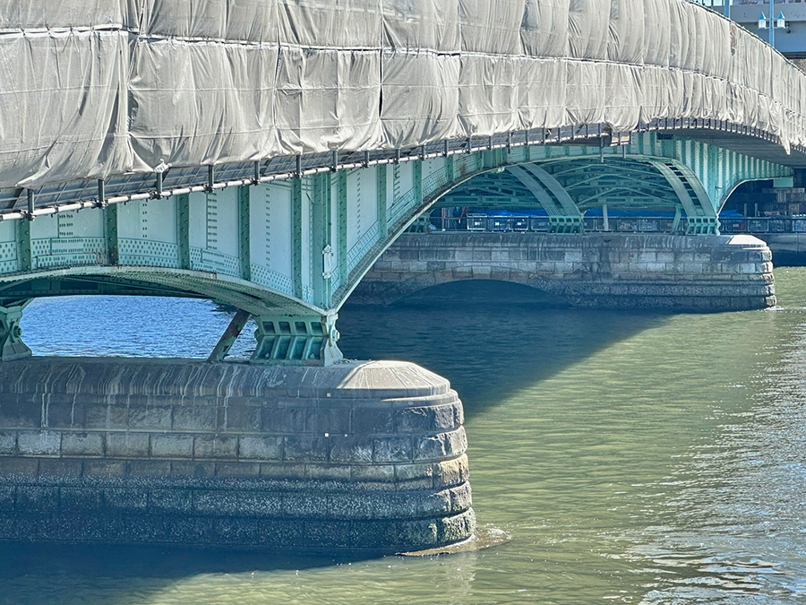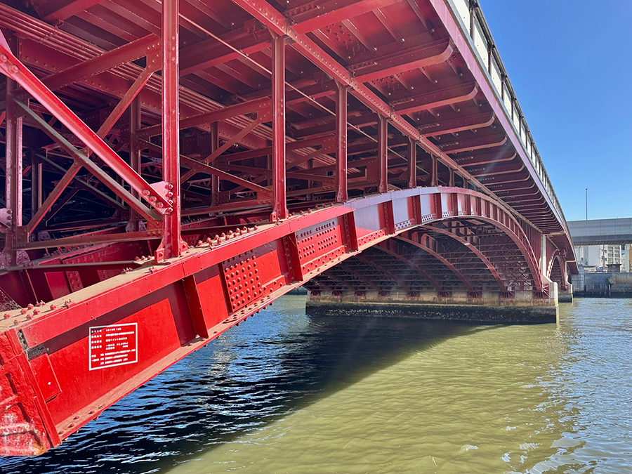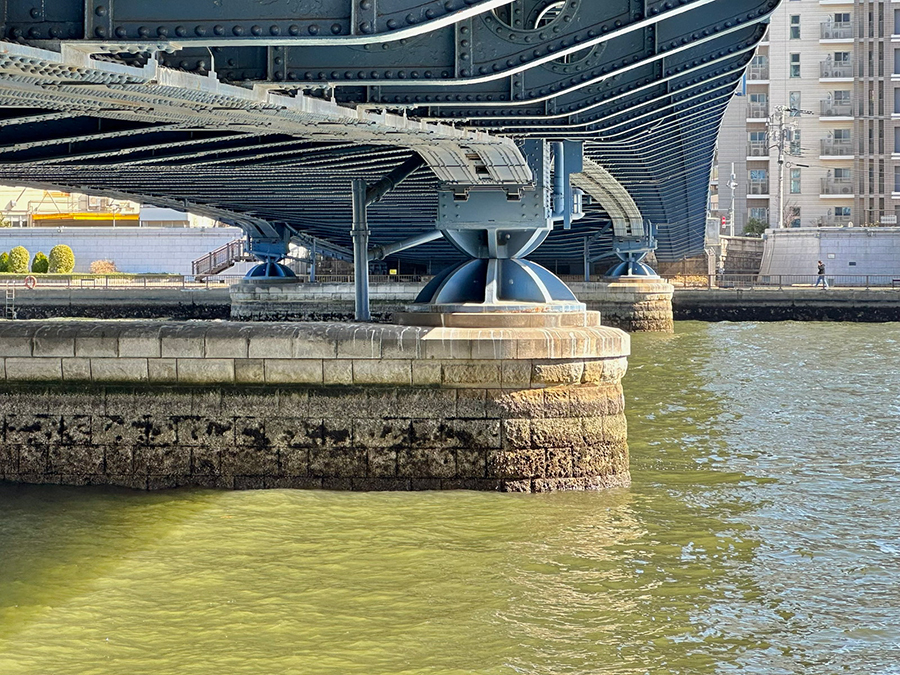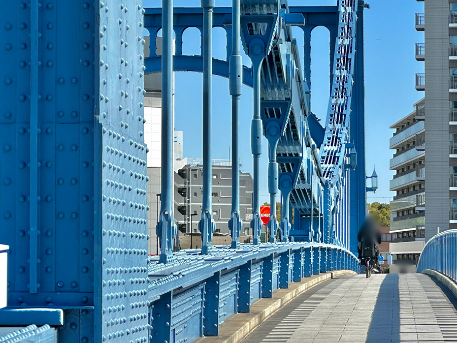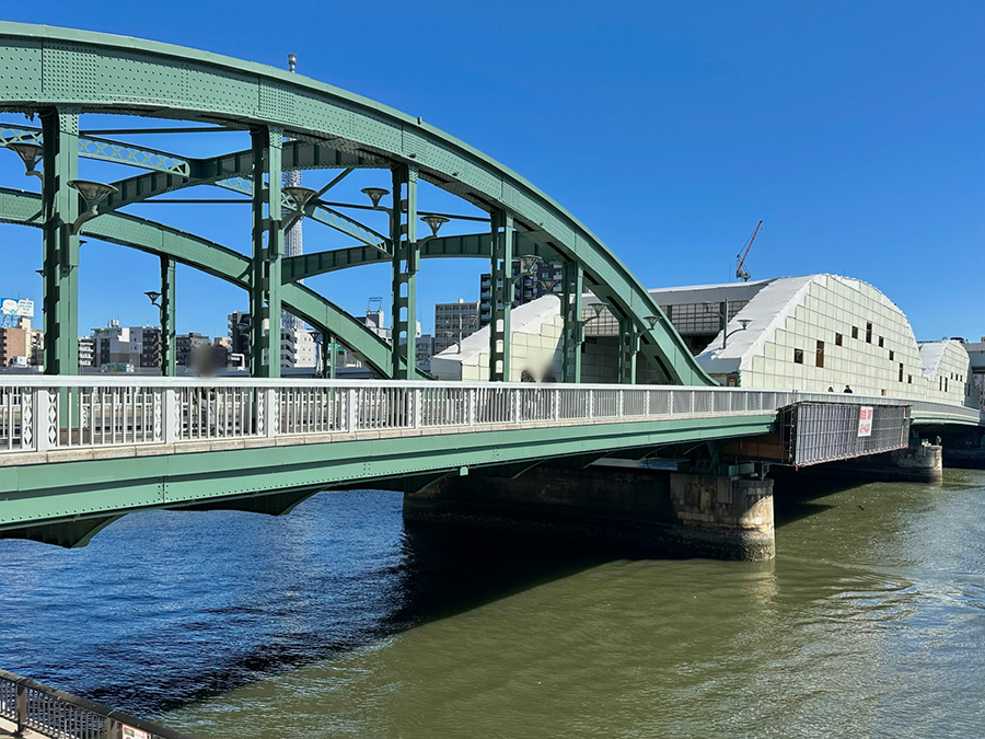 続く蔵前橋は3連アーチの上に橋桁が載っており、先ほど紹介した吾妻橋とカラーリング以外は酷似した形状です。一方で吾妻橋と明確に違うのは、橋の下。吾妻橋の橋下は墨田区側が通り抜け不可、台東区側が小さなトンネル通路になっているのに対し、蔵前橋は川沿いの遊歩道がそのまま橋下を通っているので、アーチ橋の鉄骨を橋の裏側からじっくり観察できます。