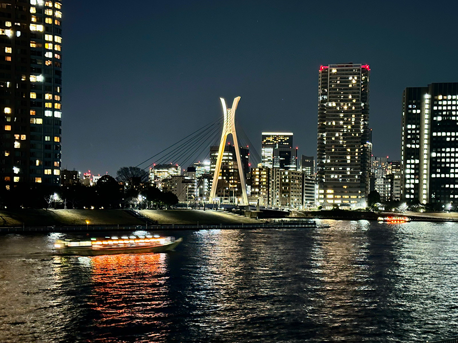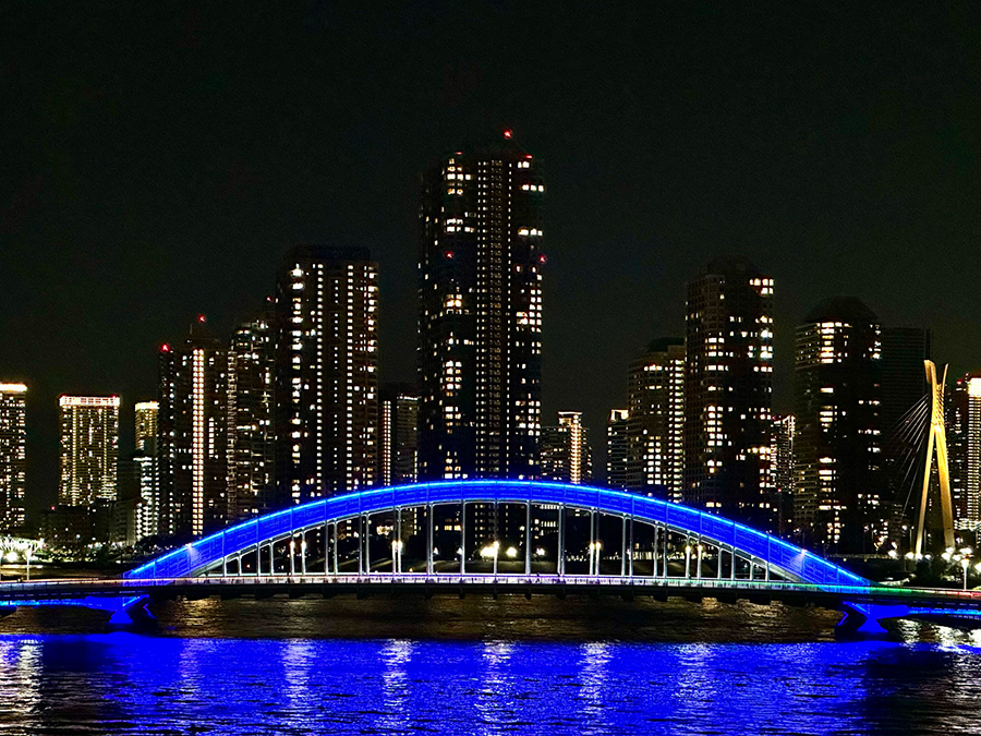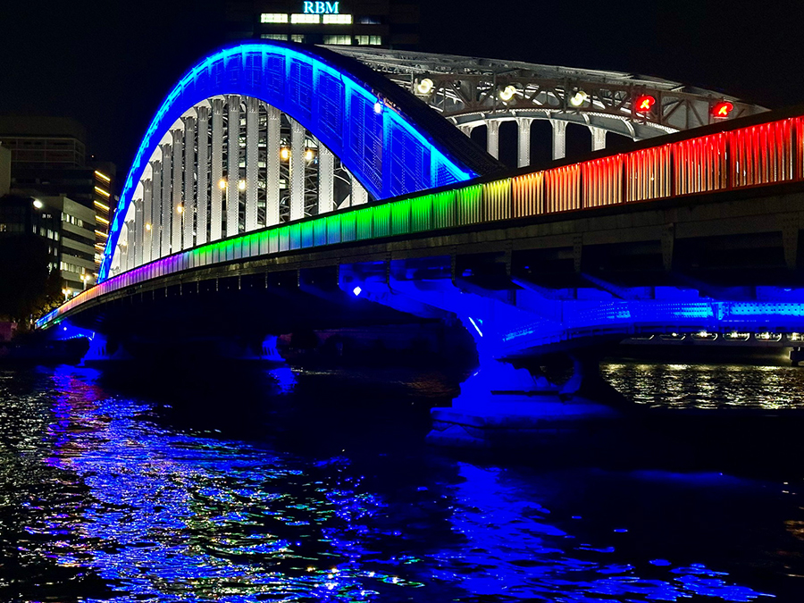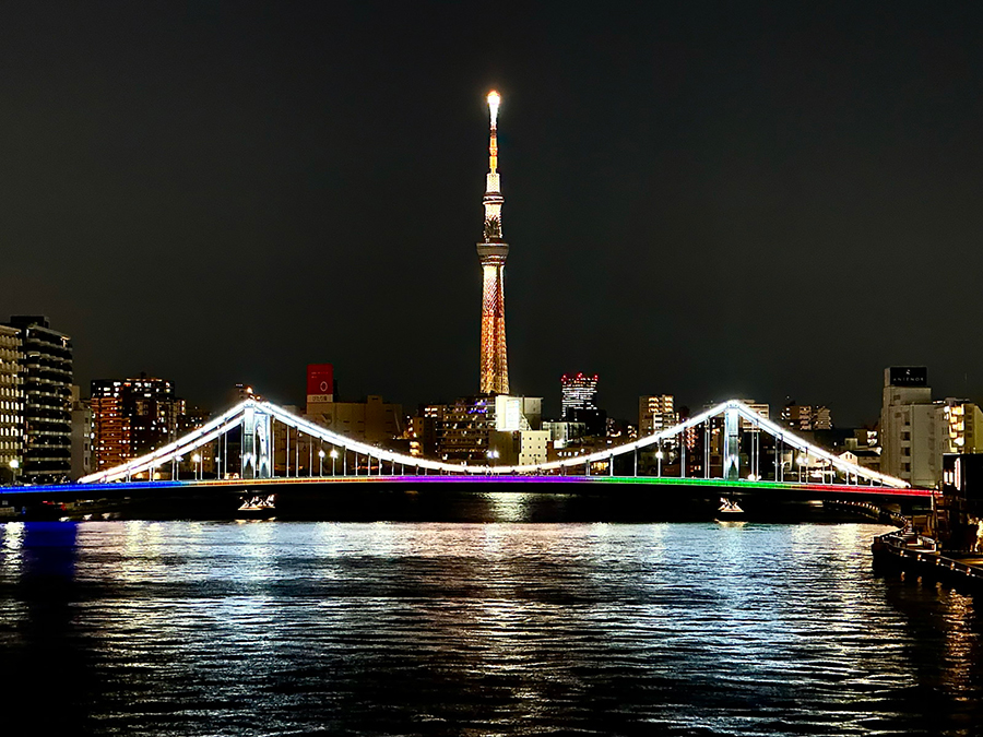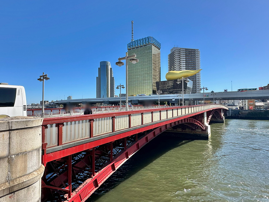 橋の形式は弓状構造物(アーチ)の上に橋桁を載せた「上路式ヒンジアーチ橋」。浅草寺のような真っ赤な見た目が力強くも華やかで、夜間ライトアップも美しいため、特に橋下の川沿い遊歩道がデートスポットとして人気です。墨田区側のアサヒグループ本社ビルとオブジェ、墨田区役所、スカイツリーもライトアップされて吾妻橋と同じ画角に入るので、とりわけ夜にSNS映えする橋と言えます。