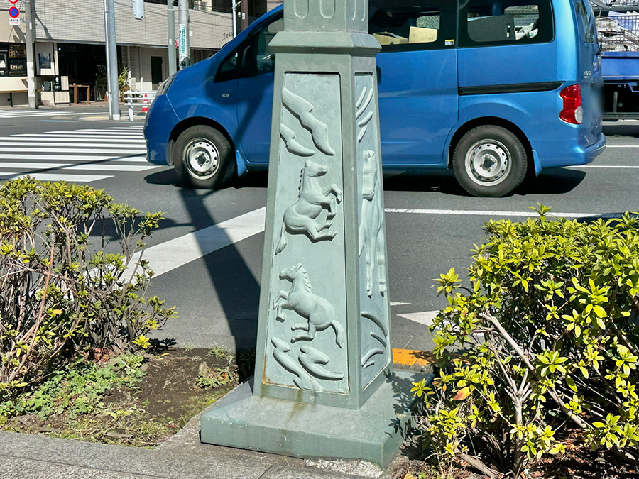 その名の由来は江戸時代に幕府の「御厩(馬屋)」が多数あったことから。この橋名に合わせて、親柱や照明などには1987〜1989年の再整備により馬のレリーフが取り付けられています。