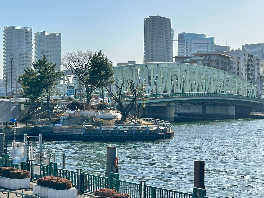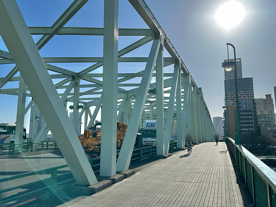 震災後に架設された橋梁は老朽化のため平成期に架け替えられ、現在はトラス橋となっています。橋の月島側ではタワーマンション(リバーシティ21)に隣接する水辺の公園(中央区立石川島公園)でくつろげるほか、越中島側には東京海洋大学のキャンパスや見学施設があるなど、周辺の散策スポットにも恵まれています。